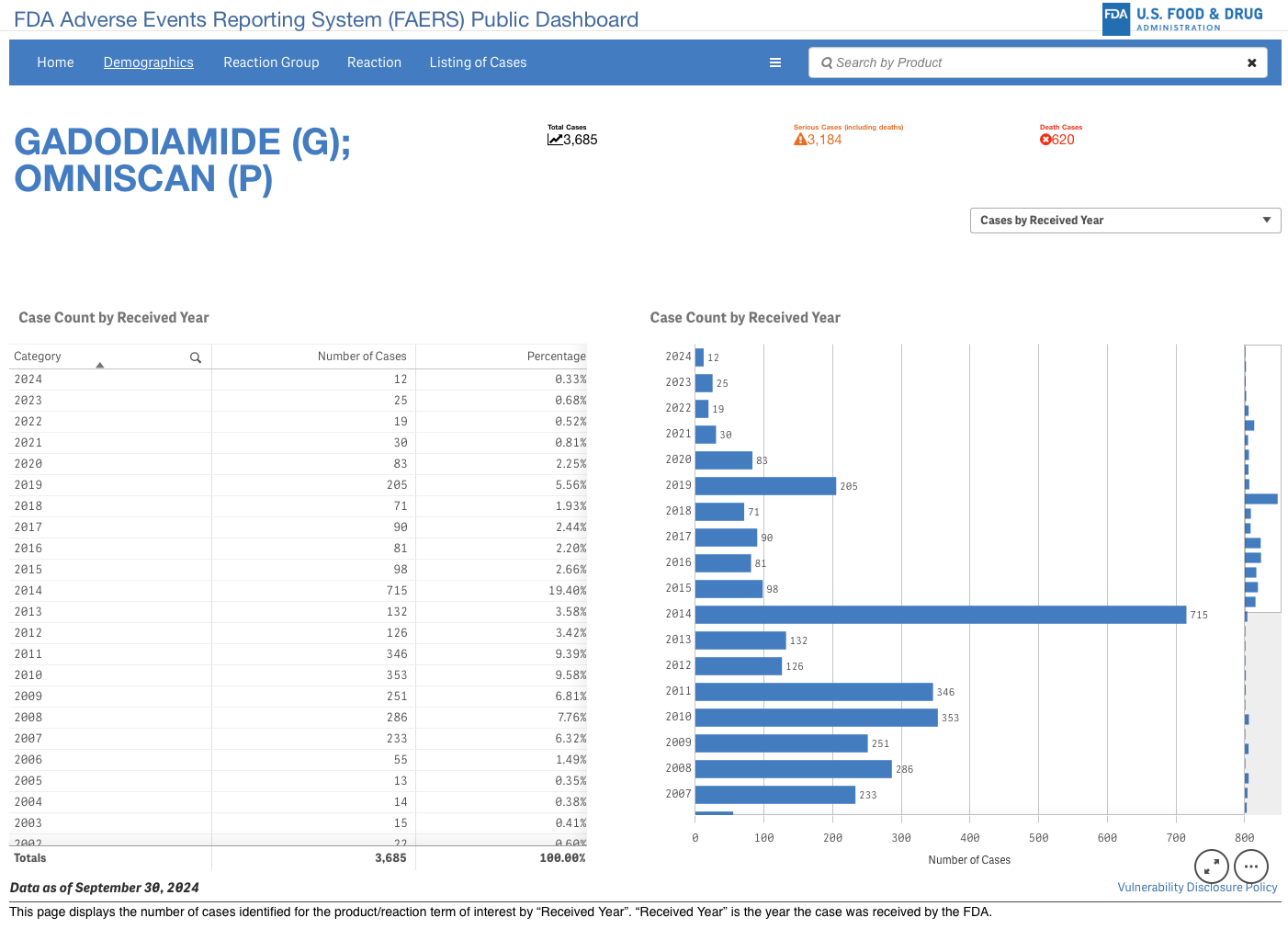 However, patients who did a Freedom of Information Act pull in August 2016 revealed 33,000 reports with one singular GBCA product, Magnevist. How is it possible that, today, the total reported cases are fewer than those for one product nearly a decade ago? Could reports be lost or suppressed before reaching public awareness, akin to how one MRI contrast company reportedly instructed employees to “Burn the Data”? Or are these simply global reports? And how many cases are left unreported? How many countless individuals don’t have the information to acknowledge or recognize gadolinium as the cause of their illness?